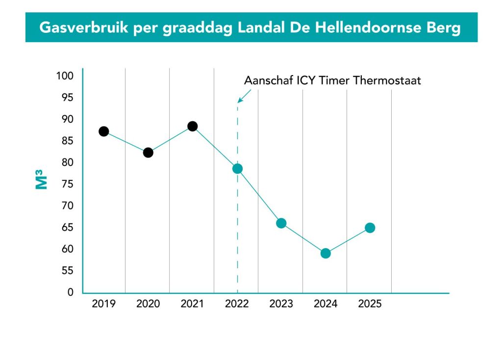 Bij Landal Landgoed de Hellendoornse Berg heeft het vervangen van hun thermostaten door ICY Timer Thermostaten geleid tot een aantoonbare gemiddelde gasbesparing van 26%, terwijl het comfort voor gasten volledig behouden bleef. Zie onderstaande grafiek, waarin het gasverbruik voor dit park per graaddag wordt weergeven.